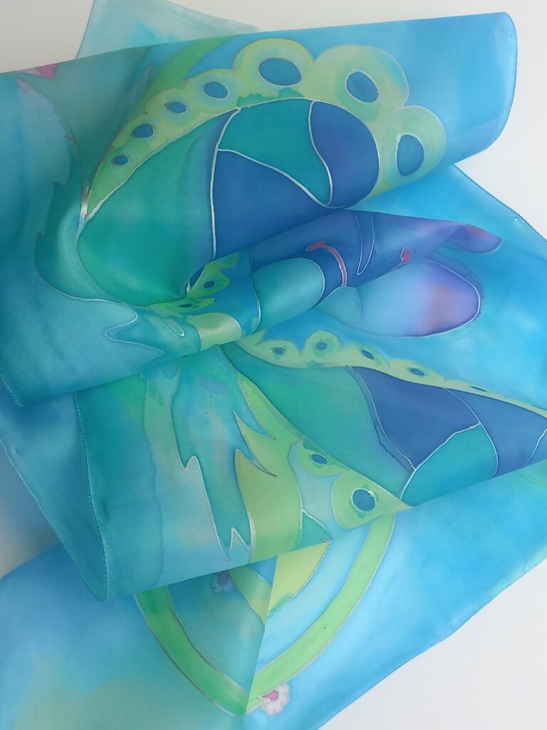 Prace tworzone na jedwabiu i lnie – malowane tkaniny, formy dekoracyjne oraz elementy użytkowe inspirowane naturą i kolorem.